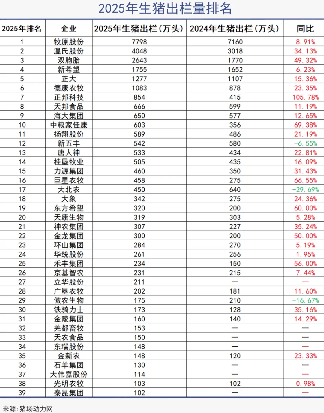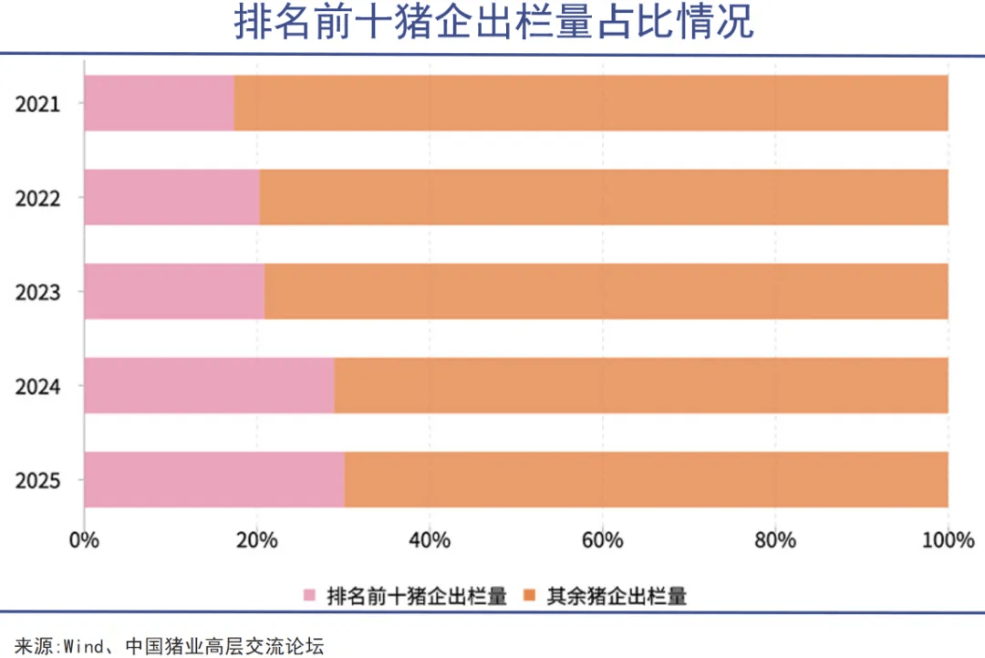 与此同时,行业进一步集中。去年出栏量超百万头的猪企达39家,同比增加7家,合计出栏2.95亿头,增长5800万头,增幅高达24.5%,这些头部企业的出栏量贡献了全国的41%,占比抬升9个百分点。