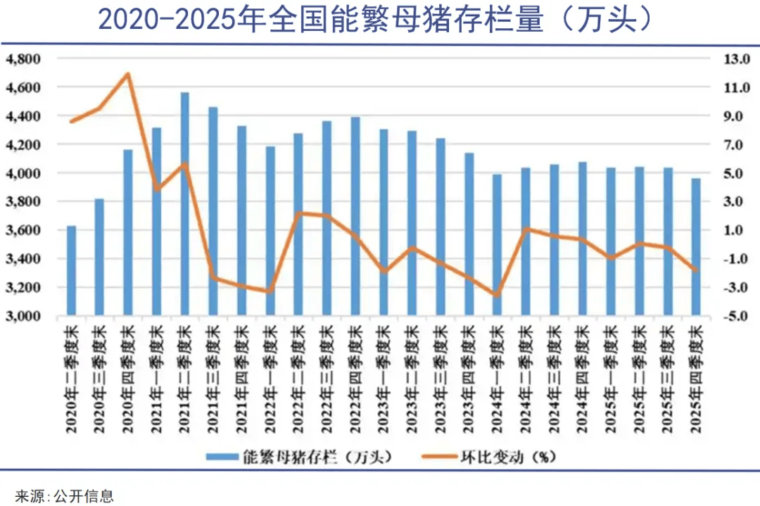 首先是供给端去化缓慢。能繁母猪存栏量是影响供给的核心指标,直接决定生猪出栏量。截至2025年底,我国能繁母猪存栏量降到3961万头(较前年去化116万头),但仍高于农业农村部3650万头的调控目标。